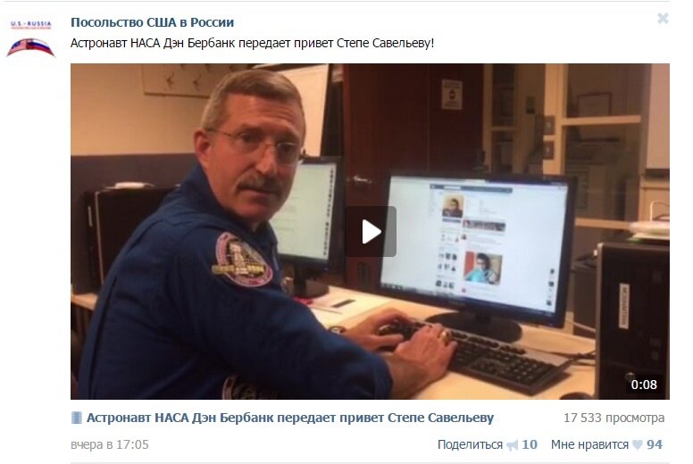 Видеообращение было опубликовано на странице посольства США в России в социальной сети "ВКонтакте". Астронавт сказал: "Привет, Степа! Меня зовут Дэн Бербанк, я астронавт, я хотел бы сказать: удачи тебе".