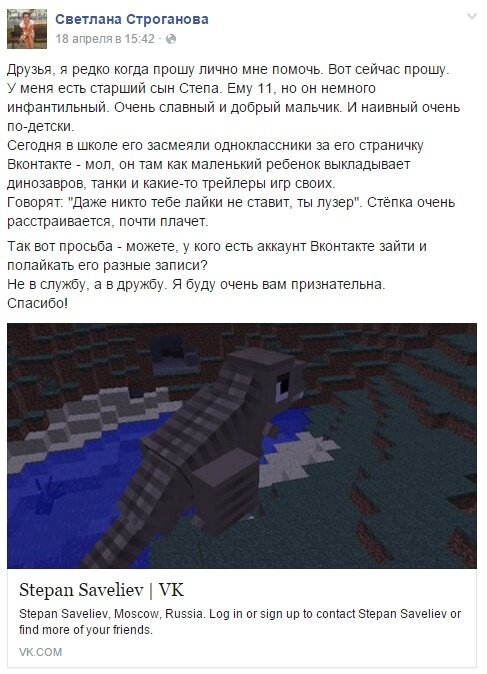 Ранее мать Степана Светлана Строганова опубликовала на своей странице в Facebook призыв поставить лайки под его постами. Связно это с тем, что мальчик интересуется динозаврами и компьютерными играми. Из-за этого он подвергается постоянным насмешкам одноклассников, которые говорят: "Даже никто тебе лайки не ставит, ты лузер". Из-за этого Степа очень расстраивается и чуть не доходит до слез.