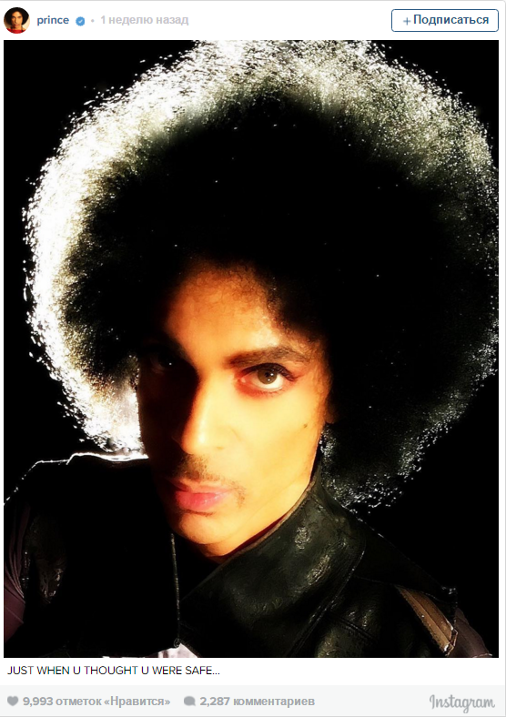 Предпоследней фотографией Принса стало селфи, под которым он оставил многозначительную и недосказанную подпись: "Только ты подумал, что ты в безопасности...".