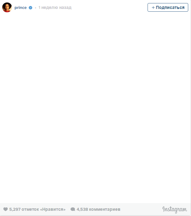 Американский певец Принс, о смерти которого стало известно сегодня, 21 апреля, за неделю до своей кончины выложил в "Инстаграме" загадочный рисунок. Певец запостил самый обычный белый квадрат, под которым не оставил ни одного комментария.