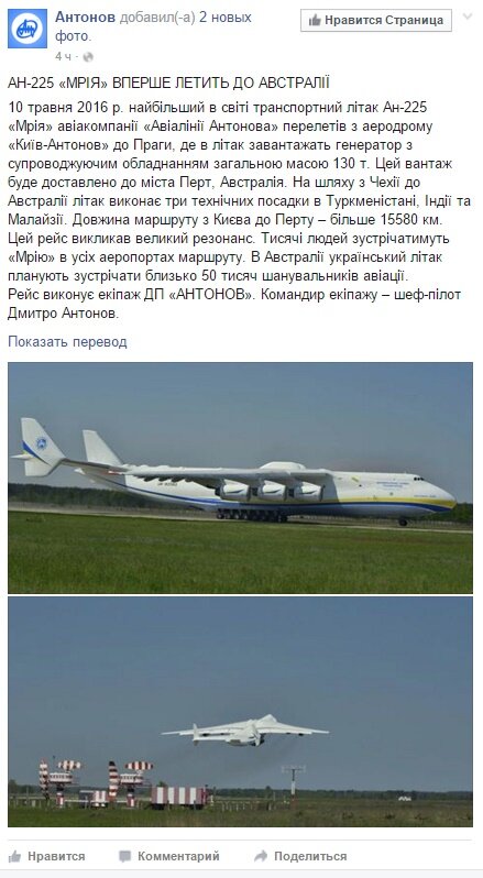Воздушное судно вылетело с аэродрома в Гостомеле, расположенного под Киевом, в Прагу. В Чехии в самолет погрузят генераторы и другое оборудование, общая масса которого составляет порядка 130 тонн.