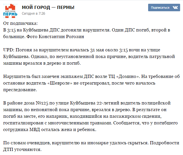 По версии очевидцев ДТП из соцсетей, автомобили "встретились" не случайно: сотрудники ДПС преследовали нарушителя, однако тот мастерски уходил от погони. Также жители Перми сообщают, что виновник смертельной аварии находился за рулем "Шевроле". Возле ТЦ "Домино" он проигнорировал требование сотрудников ДПС об остановке, после чего и завязалась погоня.