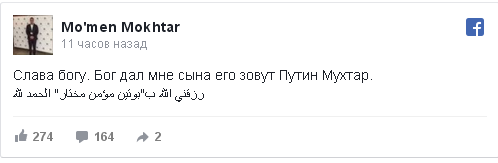 "Слава богу. Бог дал мне сына, его зовут Путин Мухтар", - написал журналист в Facebook.