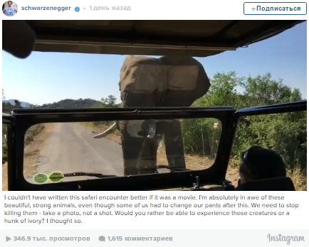 "Не смог бы описать данную встречу на сафари красочнее, чем на видео. Я восторгаюсь этими красивейшими, сильнейшими животными, хотя некоторые из нас после данного инцидента поменяли штаны", - пишет актер.