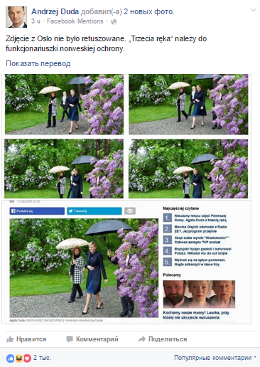 В канцелярии главы Польши Анджея Дуды рассказали, что фото не проходило обработку, а "третья рука" - рука работницы Бюро охраны правительства, которая гуляла совместно с первой леди страны.