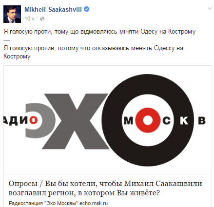 "Я голосую против, потому что отказываюсь менять Одессу на Кострому", – написал Саакашвили в ночь на пятницу, 3 июня, в соцсети.