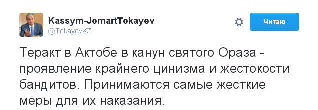Власти принимают самые жесткие меры для наказания боевиков. Об этом "Твиттере" заявил председатель Сената Парламента РК Касым-Жомарт Токаев.