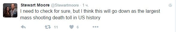 На своей странице в Twitter он написал: "Мне нужно проверить, но думаю, что это (стрельба в Орландо — ред.) войдет в историю как крупнейший массовый расстрел в США".