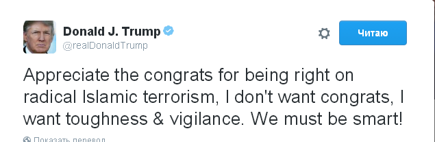"Ценю признания, что я был прав насчет радикального исламского терроризма. Мне не нужны поздравления. Я хочу твердости и бдительности. Нам следует быть предусмотрительными", - написал он в "Твиттере".