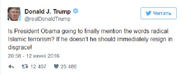 В своем твиттере Трамп риторически поинтересовался, будет ли Обама осуждать атаку исламистов на гей-клуб во Флориде, посчитав, что в противном случае он должен сложить президентские полномочия до того, как завершится его президентский срок.