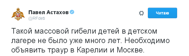 "Такой массовой гибели детей в детском лагере не было уже много лет. Необходимо объявить траур в Карелии и Москве", - сказано в сообщении.