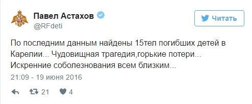 К вечеру воскресенья, 19 июня, число погибших в результате опрокидывания лодок с детьми в Карелии уже достигло 15 человек. В ходе поисковой операции спасателями было найдено тело еще одного ребенка.