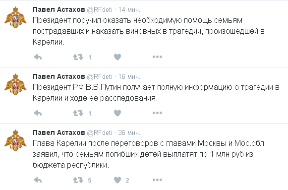 Тем временем глава Карелии после переговоров с руководителями Москвы и области заявил, что семьям погибших детей выплатят по 1 млн руб из бюджета республики.