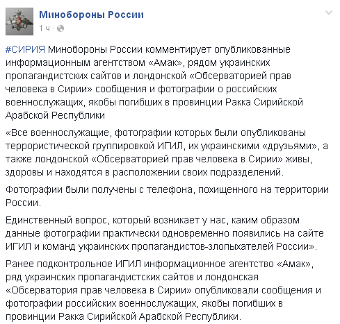 "Все военнослужащие, фотографии которых были опубликованы террористической группировкой ИГИЛ , их украинскими "друзьями", а также лондонской "Обсерваторией прав человека в Сирии" живы, здоровы и находятся в расположении своих подразделений", - сказано в сообщении.
