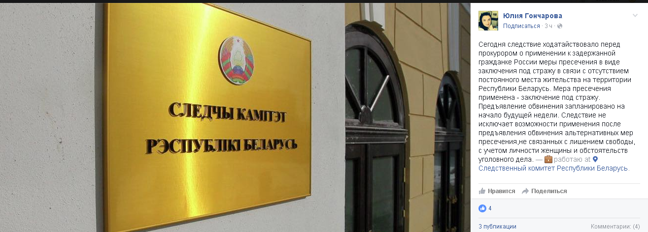 По ее словам, в связи с отсутствием постоянного места жительства на территории Белоруссии в отношении россиянки применена мера пресечения - заключение под стражу.