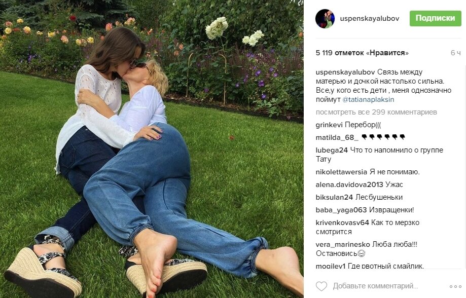 Однако пользователи сочли данный снимок двузначным и слишком вульгарным. Мать и дочь, которые лежат на газоне и целуются, вызвали резкое осуждение со стороны возмущенных фанатов. "Как-то мерзко смотрится", "Где рвотный смайлик", "Более чем странный поцелуй", "Что-то не так с этим снимком", "Фу, какая гадость", "Странное проявление любви", "Что за мерзота?" - такие возмущенные комментарии оставляли недовольные подписчики Успенской в Instagram. Пока что звезда никак не отреагировала на заявления фанатов.