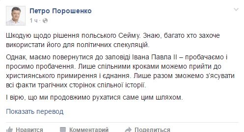 Комментируя пятничное голосование польского сейма, Порошенко отметил, что ожидал совсем другого результата и огорчен статусом геноцида преступлений украинских националистов против польского населения Волыни в период Второй мировой войны.
