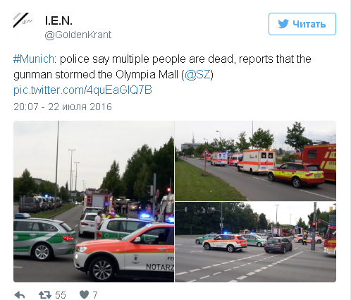 В пятницу, 22 июля, в торговом центре Мюнхена, который расположен вблизи Олимпийского парка, произошла стрельба. По данным СМИ, от пулевых ранений погибли 15 человек. Торговый центр эвакуирован.
