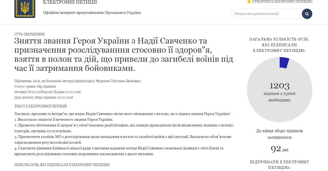 Петиция о снятии с украинской летчицы Надежды Савченко звания Героя Украины за сутки собрала более тысячи подписей. Кроме того, автор петиции настаивает, чтобы контрразведка и следствие занялись детальным изучением последних двух лет жизни Савченко.