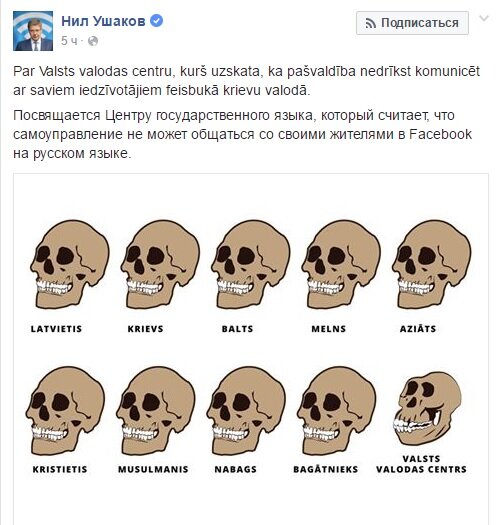 Ушаков разместил карикатуру на своей странице в Facebook и назло Центру оставил подпись под постом на русском языке. На карикатуре изображены несколько черепов неандертальцев, один из которых нестандартной формы и с искривленным голосовым аппаратом. Под ним на латышском языке значится подпись "Центр государственного языка".