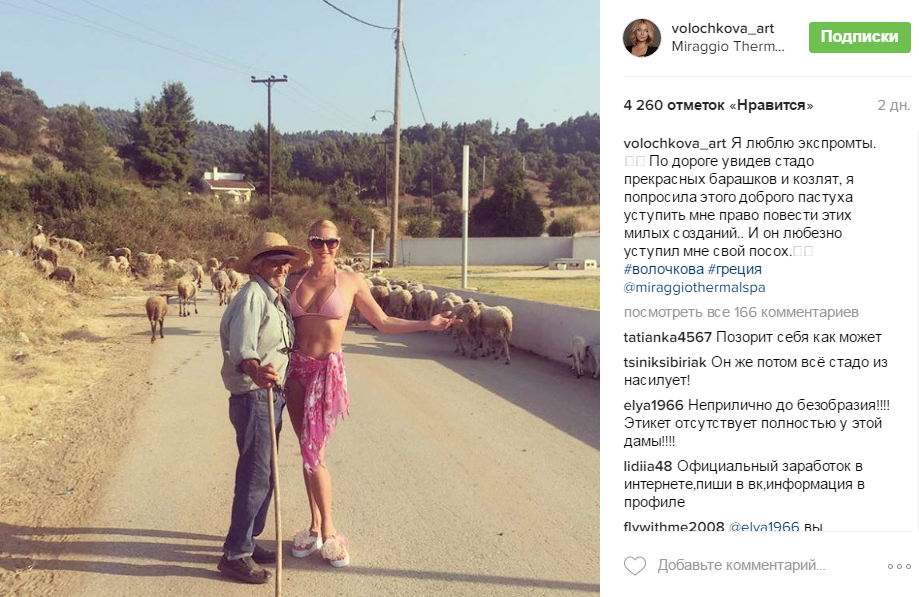 Позднее Анастасия опубликовала видео-предысторию. Оказалось, что Волочкова гуляла со стадом, тогда поздоровалась за руку с пастухом и после этого попросила дочь сфотографировать ее с местным жителем. "Как я вам в роли пастуха?", - подписала видеоролик знаменитая блондинка.