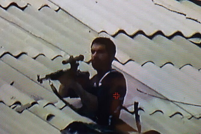 Правоохранители выяснили, откуда именно был произведен выстрел по автомобилю полиции - как оказалось, снайпер располагался на крыше здания, стоящего в 400 метрах от места расстрела авто. После того, как удалось выяснить место дислокации боевика со снайперской винтовкой, показался и он сам, благодаря чему у полиции появилось его фото.