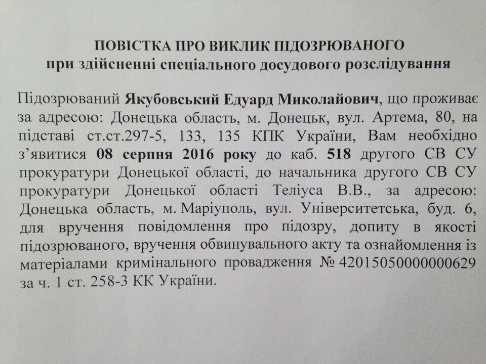 В повестке сказано, что Якубовский должен 8 августа 2016 года явиться в отделение прокуратуры Донецкой области, расположенное в Мариуполе.