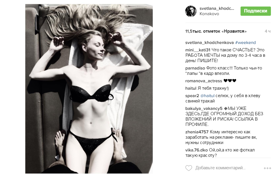 Также они выразили восхищение прекрасной фигурой Ходченковой. "Фото класс! Только какие-то лапы в кадр влезли", "Самая лучшая и красивая актриса", "Стройняшка", - писали восхищенные подписчики. Всего за 4 часа публикации фото набрало 11,5 тысяч лайков от восторженных пользователей.