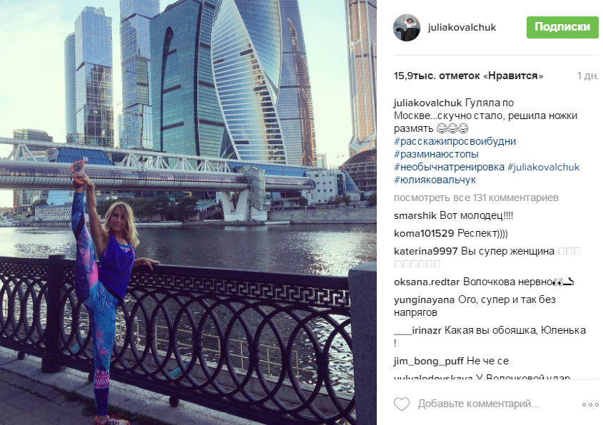 Фото со шпагатом часто публикует известная балерина Анастасия Волочкова. Она даже придумала хэштег "шпагатволочковой", который стал своеобразным брендом. Именно по этой причине подписчики Юлии начали сравнивать ее со скандальной знаменитостью. Правда, они уточнили, что шпагат Юлии выглядит "не так пошло", как у Волочковой, которая демонстрирует растяжку исключительно в мини-трусиках.
