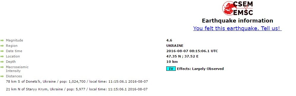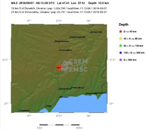 Сейсмологи утверждают, что эпицентром подземных толчков стал поселок Кременевка, расположенный в 32 километрах от Мариуполя. Сообщается, что землетрясение возникло на глубине около 10 километров, а его магнитуда составила 4,6 балла по шкале Рихтера.