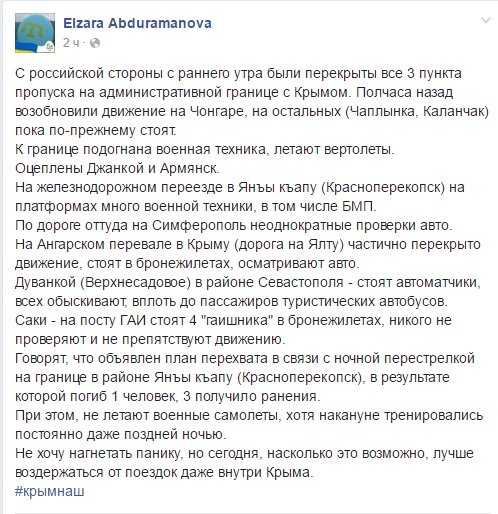 На данный момент оцеплены оказались два приграничных города - Армянск и Красноперекопск. На улицах города можно увидеть бронетехнику и автоматчиков в форме. Кроме того, в воздух также были подняты несколько военных вертолета. По словам источника, в Крыму и на границе проходит спецоперация по поимке диверсантов.