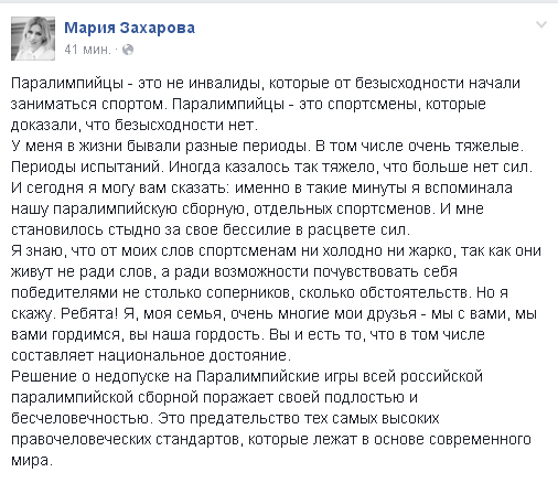 "Решение о недопуске на Паралимпийские игры всей российской паралимпийской сборной поражает своей подлостью и бесчеловечностью. Это предательство тех самых высоких правочеловеческих стандартов, которые лежат в основе современного мира", - отметила Захарова.