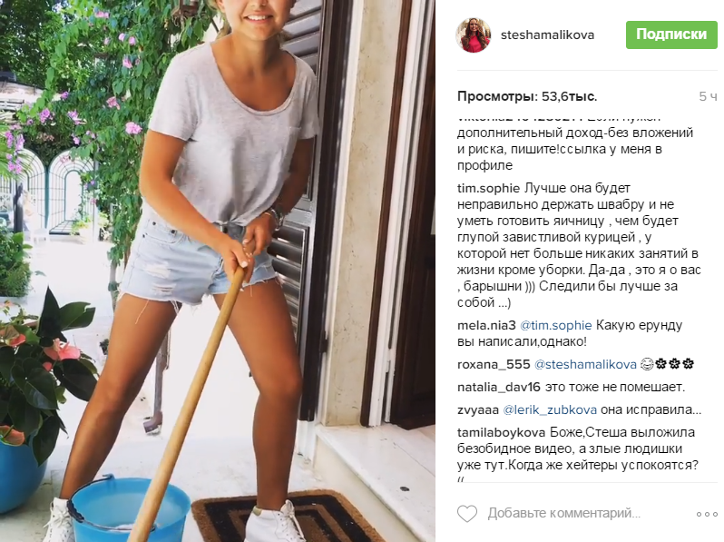 Много подписчиков заступилось за Стешу, утверждая, что нет инструкции к швабре и каждый моет пол так, как ему удобно. "Что за бред? Неужели есть уроки по мытью пола и держанию швабры?", "Лучше она будет неправильно держать швабру, чем будет глупой завистливой курицей, у которой нет других занятий, кроме уборки", - защищали девушку преданные фанаты.