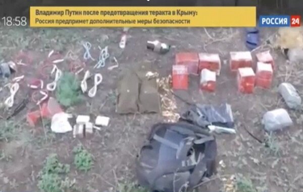 Сюжет с изъятыми у диверсантов вещественными доказательствами целей их прорыва в Крыма показал канал "Россия-24". В раскрытом сотрудниками ФСБ схроне украинской ДРГ находился арсенал оружия и большое количество взрывчатки.