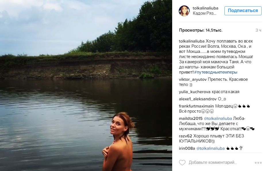 "Хочу поплавать во всех реках России", - поделилась планами звезда. Пока что Толкалина искупалась только в реке Мокша, однако на этом не собирается останавливаться. Отметим, что снимала обнаженную актрису ее собственная мать Татьяна. Чтобы пресечь любые попытки обвинить актрису в излишней откровенности, Любовь написала следующее обращение: "А что до наготы – ханжам большой привет".