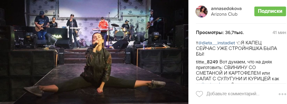 Однако недавно в Instagram Анна порадовала фолловеров, продемонстрировав свой шпагат прямо во время выступления песни "Я буду". Седокова пела, сидя на сцене, и в один момент девушка решила показать растяжку. После этого Анна допела припев уже лежа на сцене. "Саундчек и немного фитнеса от Анны", - подписала снимок довольная звезда.