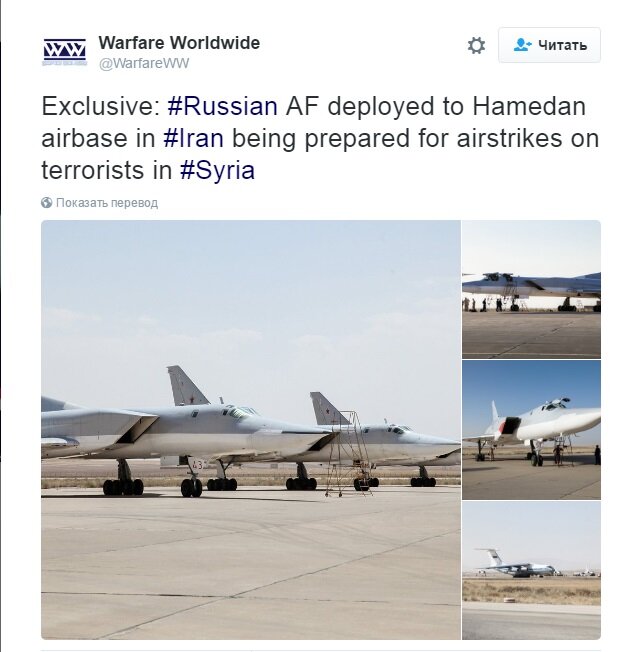 Как сообщают авторы проекта Warfare Worldwide, несколько российских самолетов прибыли на иранскую авиабазу Хамадан днем в понедельник. Именно отсюда самолеты ВКС РФ будут совершать боевые вылеты в Сирию для нанесения авиаударов по позициям боевиков ИГИЛ (запрещенная в России террористическая организация - ред.)