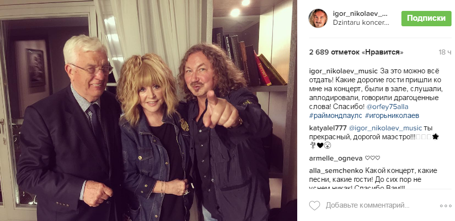 Совместный снимок с любимой певицей опубликовал счастливый юбиляр Игорь Николаев. "За это можно все отдать! Какие дорогие гости приходили на мой концерт, были в зале, слушали, аплодировали, говорили драгоценные слова", - поблагодарил Николаев Аллу и Раймонда Паулса, который также был запечатлен на фото.