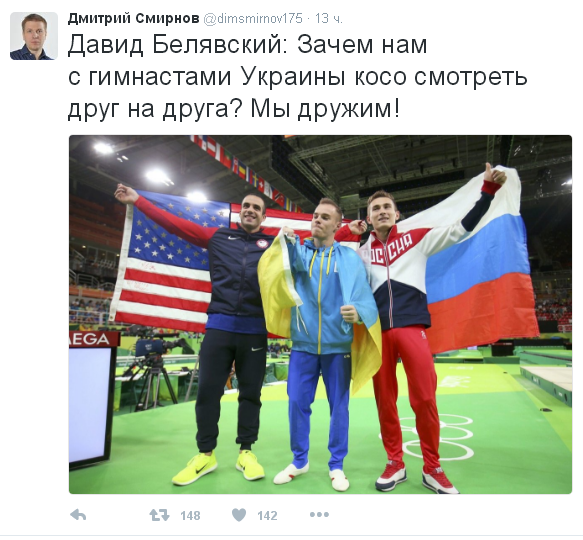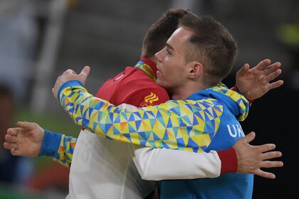 Напомним, накануне после завоеванного "золота" в упражнениях на брусьях на Олимпиаде в Рио украинский гимнаст из Донецка Олег Верняев вновь демонстративно показал, что на соревнованиях в Бразилии между российскими и украинскими спортсменами царит дружба, после награждения обняв ставшего третьим Давида Белявского.