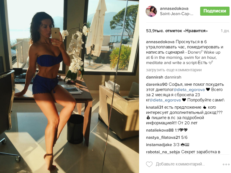 Также Седокова не упустила возможность похвастаться активностью. В подписи под снимков Анна призналась, что проснулась в 6 часов утра и успела поплавать, помедитировать и написать сценарий.
