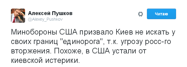"Минобороны США призвало Киев не искать у своих границ "единорога", т.к. угрозу росс-го вторжения. Похоже, в США устали от киевской истерики", - написал Пушков.