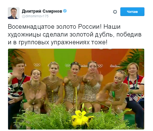 "Восемнадцатое золото России! Наши художницы сделали золотой дубль, победив и в групповых упражнениях тоже!" - написал на своей странице в "Твиттере" журналист Дмитрий Смирнов.