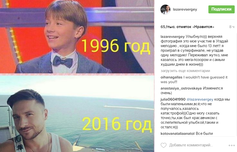Недавно Сергей опубликовал свое детское фото, продемонстрировав, как он выглядел в 13 лет. Певец выложил фото, сделанное во время участия в суперфинале шоу "Угадаю мелодию" в 1996 году. Как признался Лазарев, в финале он проиграл, не угадав всего одну мелодию, за что ему было ужасно стыдно. "Мне казалось это мега-позором и худшим днем в жизни", - признался Сергей.