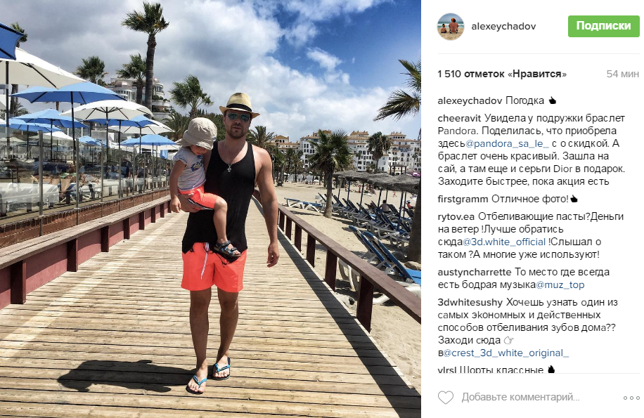 На отдыхе Алексей буквально не спускает с ребенка глаз. Малыш находится постоянно возле звездного папы: Чадов гуляет с сыном и если тот устает, берет его на руки, купается с ним в бассейне и даже присматривает, когда малыш играет в песочнице.