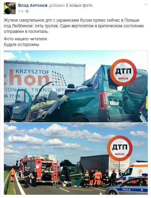 "Жуткое смертельное дтп с украинским бусом прямо сейчас в Польше под Люблином: пять трупов. Один вертолетом в критическом состоянии отправлен в госпиталь", - пишут очевидцы.