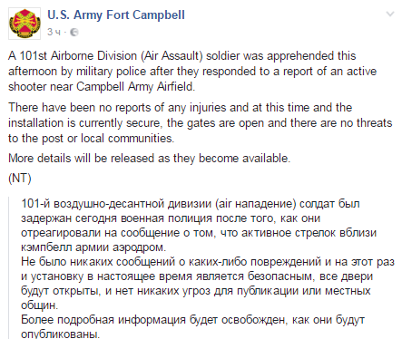 На расположение сухопутных сил США напал вооруженный военнослужащий 101-й воздушно-десантной дивизии.