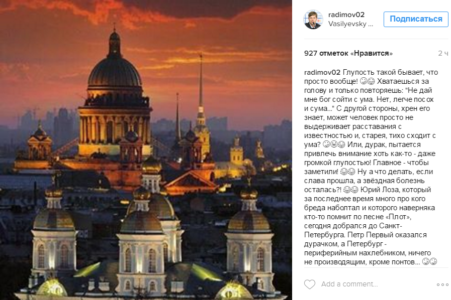 Общественность негативно отреагировала на скандальное предложение певца. В частности, коренной житель Петербурга, тренер команды "Зенит-2" Юрий Радимов написал пост в своем Instаgram, в котором предположил, что заявление Лозы – это попытки певца вернуть былую славу.