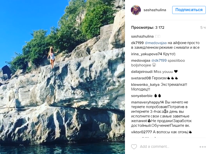 Дочь Татьяны Навки и Александра Жулина уже вовсю пробивает дорогу в шоу-бизнесе. На страницу девушки в Instagram подписываются многие поклонники, которые следят за жизнью юной знаменитости. Недавно Саша опубликовала видео, продемонстрировав смелый прыжок со скалы и вызвав массу одобрительных комментариев.