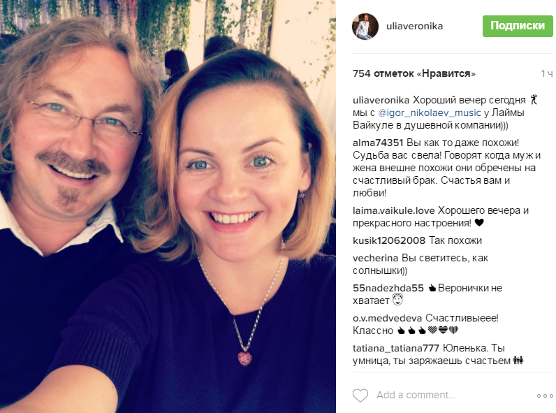 Недавно Игорь выложил в свой Instagram новый снимок с возлюбленной, на котором супруги радостно улыбались в кадр. Выяснилось, что вечер вторника звездная пара проводит у Лаймы Вайкуле, с которой у семьи очень теплые отношения. "Хороший вечер сегодня у Лаймы Вайкуле в душевной компании", - подписала фото Юлия.
