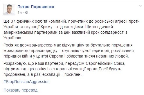Порошенко призвал Евросоюз "продолжить и усилить" антироссийские санкции вслед за США